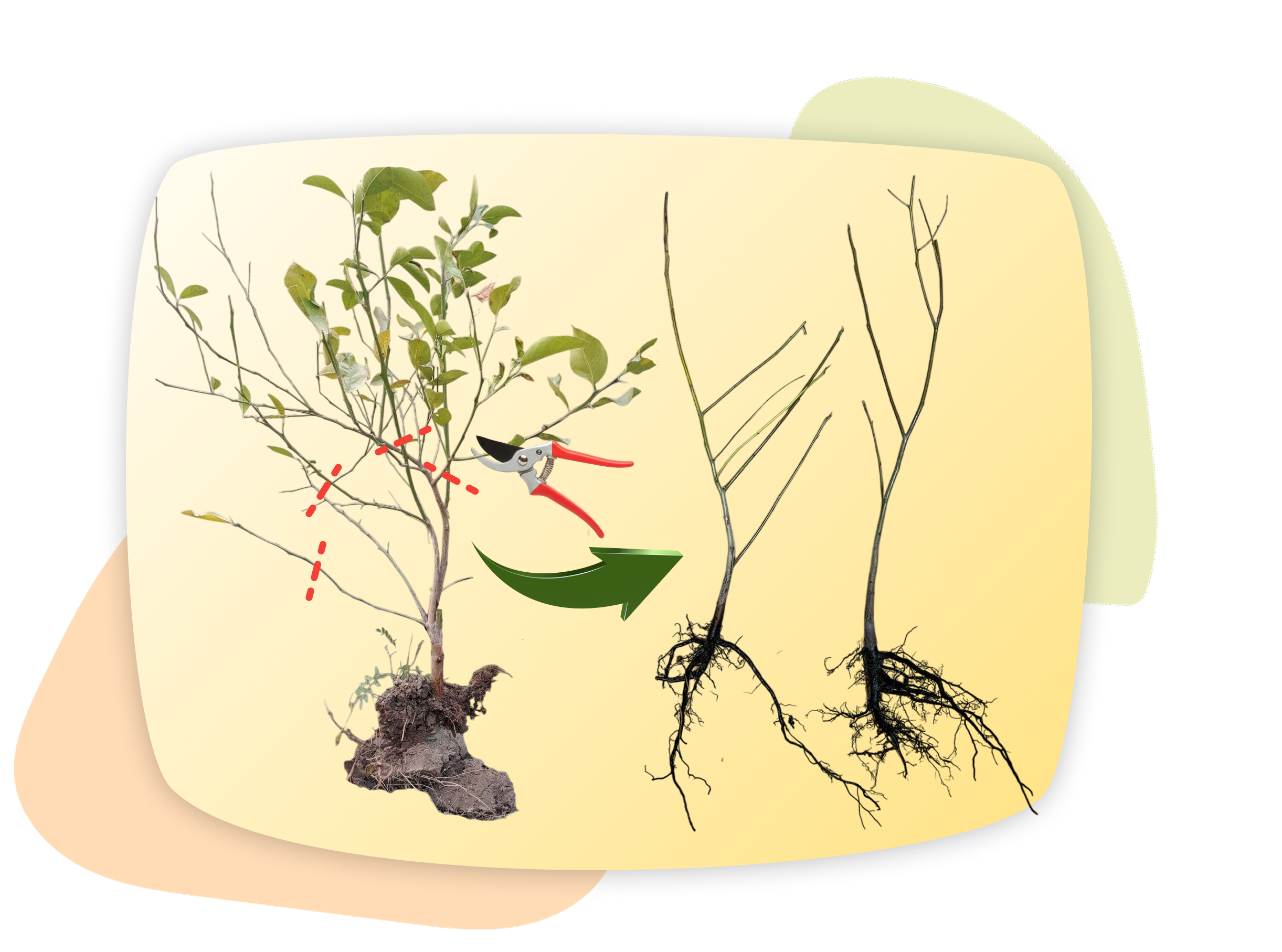 Это позволяет компактно разместить саженец в коробке для безопасной транспортировки и снизить нагрузку на растение — листья не вытягивают питательные вещества в пути.